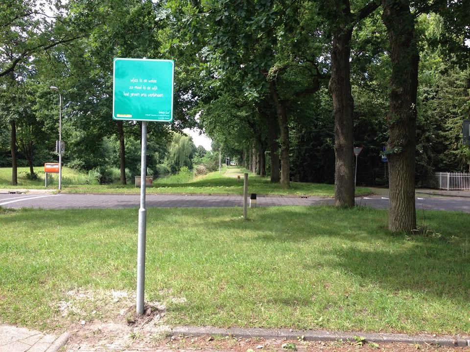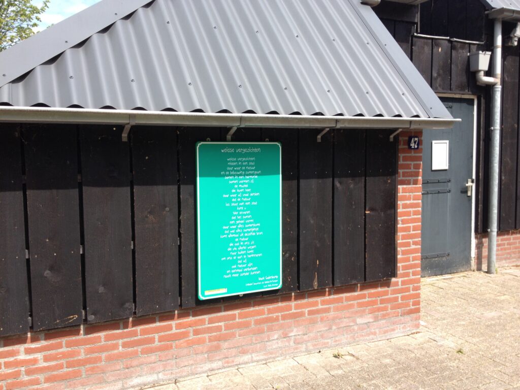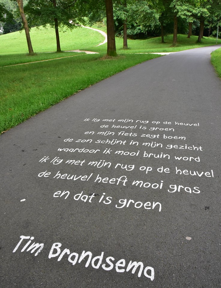 Dan wandel of fiets je door de Schutlanden, daar kom je ze tegen langs het fietspad op borden, door naar het Steenbergerpark waar je gedichten kunt lezen op het fietspad.