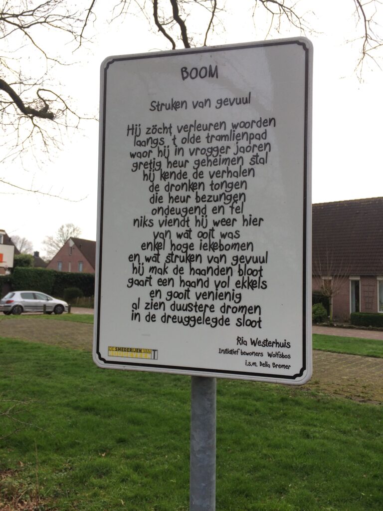 In Hoogeveen realiseerde dichteres Delia Bremer een gedichtenpad, een wandel/fietsroute waar je in de openbare ruimte meer dan 60 gedichten kunt lezen. Deze zijn geschreven door de inwoners uit hun eigen wijk. Je komt ze tegen op pilaren in het park bij het Jannes van de Sleedenhuis Wolfsbos, hangend aan gevels en op borden langs het trambaanlaantje en langs de Hoogeveense Vaart.